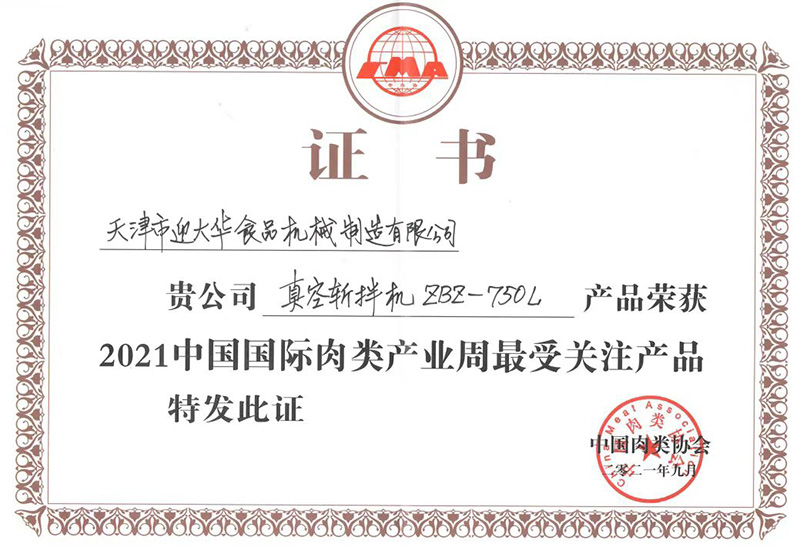 您當前的(de)位置為:主頁>拓展中心>中國肉類協會 ZBZ-750L真(zhēn)空斬拌機 獲2021年中國(guó)國際肉類產業周最受關注產品證書